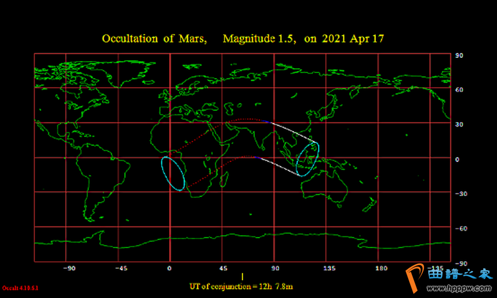 图说——4月17日月掩火星掩食带示意图(图源:国际掩星测时组织)
