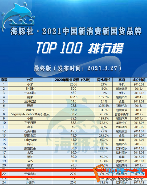 饮品赛道提速第一 元气森林入围新国货品牌T0P100~
