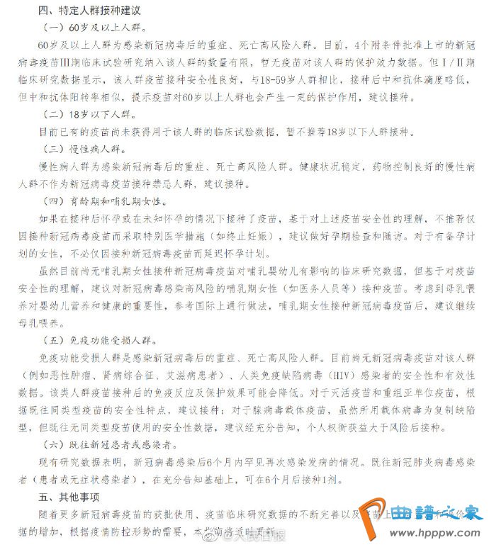 ①60岁以上人群,建议接种;②既往新冠感染者可在半年后接种1剂疫苗;③暂不推荐18岁以下人群接种新冠疫苗;④其他疫苗与新冠疫苗接种间隔应大于14天;⑤女性不必仅因接种疫苗而延迟怀孕计划;⑥哺乳期女性接种后建议继续母乳喂养。