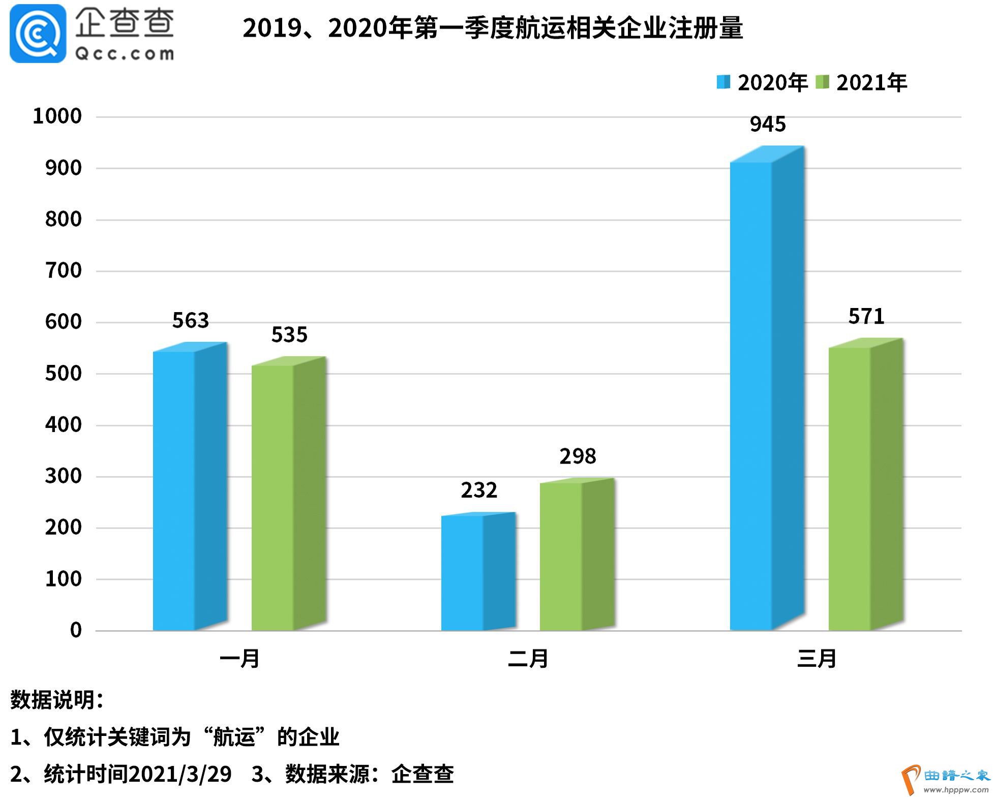 企查查数据显示,2021年一季度全国共新增1404家航运相关企业,同比下降19%。其中,一月新增535家,同比下降5%。二月仅298家,环比下降44%。三月新增571家,同比下降40%,环比增长92%。