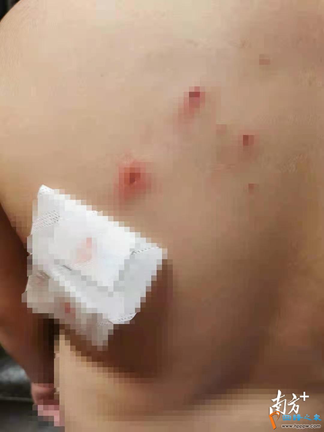 照片中,孩子背部、手臂以及眼睛多处伤口触目惊心,校服上衣被刺穿的破洞渗出血迹,该照片一经发出便引发了家长们的激烈讨论。