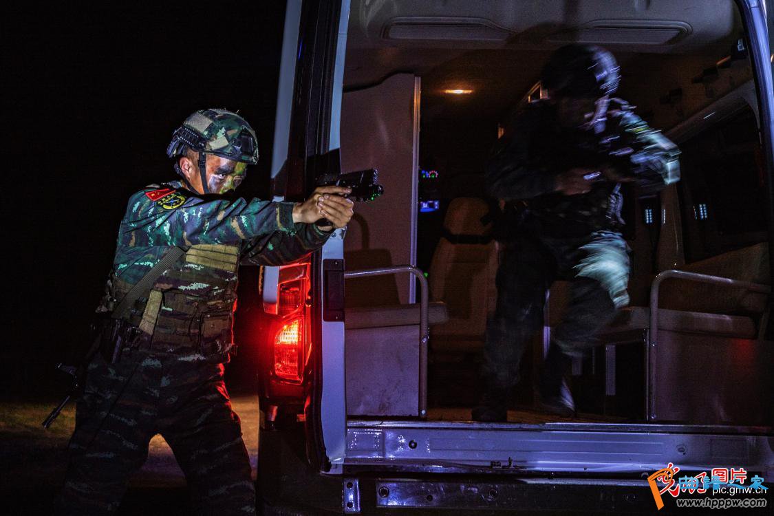 2021年4月6日晚,武警广西总队贺州支队组织特战队员开展夜间反恐综合演练,全程融入实战背景,全面检验和提高特战分队夜间反恐作战能力,为今后遂行多样化任务提供能力支撑。(余海洋 摄/光明图片)