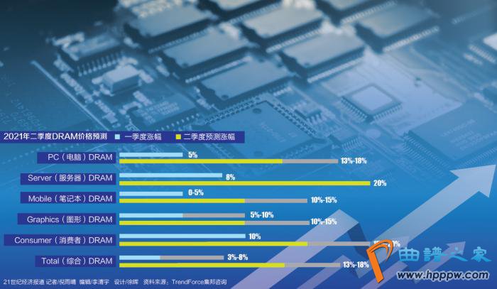 TrendForce集邦咨询最新调查也显示存储芯片持续涨价,DRAM价格已正式进入上涨周期,第二季受到终端产品需求持续畅旺影响,以及资料中心需求回升的带动,买方急欲提高DRAM库存水位。因此,DRAM均价历经第一季约3%~8%的上涨后,预估第二季合约价涨幅将大幅上扬13%~18%。