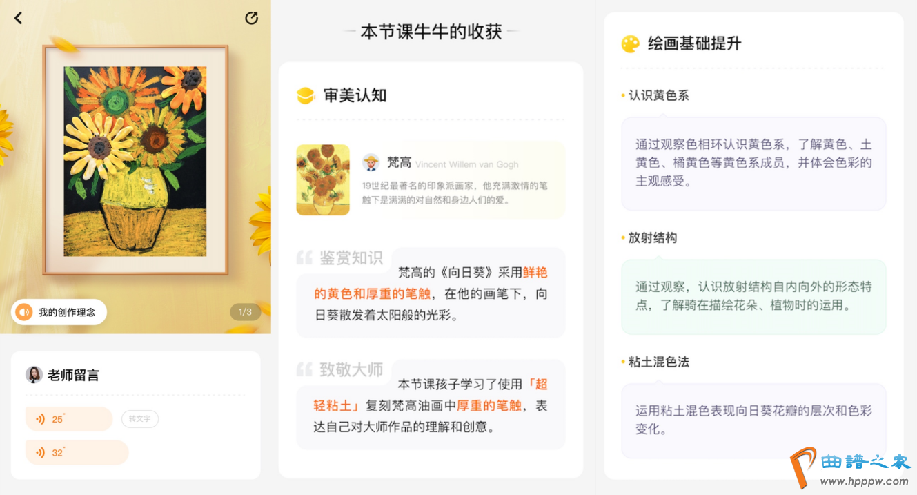 培养孩子的艺术素养要从“感受和理解”开始,对于正处在审美敏感期的孩子来说,名家经典是打开艺术视野的重要窗口,也是提升审美水平的绝佳素材。为了给孩子带来更优质的艺术素养教育,瓜瓜龙启蒙美术产品在“创意绘画课”的基础上,独家创新推出“大师艺术课”,为孩子构建完整的、多视角的审美体系。“创意绘画课”主要从有趣的动画场景引入,结合对自然美景的观察体味,循序渐进地进行美术知识讲解;“大师艺术课”则是围绕梵高、齐白石等国内外艺术大师创作的经典画作展开,带领孩子在课程中穿越时空,了解名画创作背后的故事,体会名家创作理念与思想。