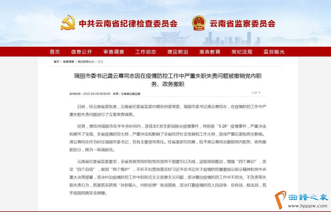据云南省纪委省监委网站通报,日前,经云南省委批准,云南省纪委省监委对德宏州委常委、瑞丽市委书记龚云尊同志,在疫情防控工作中严重失职失责问题进行了立案审查调查。