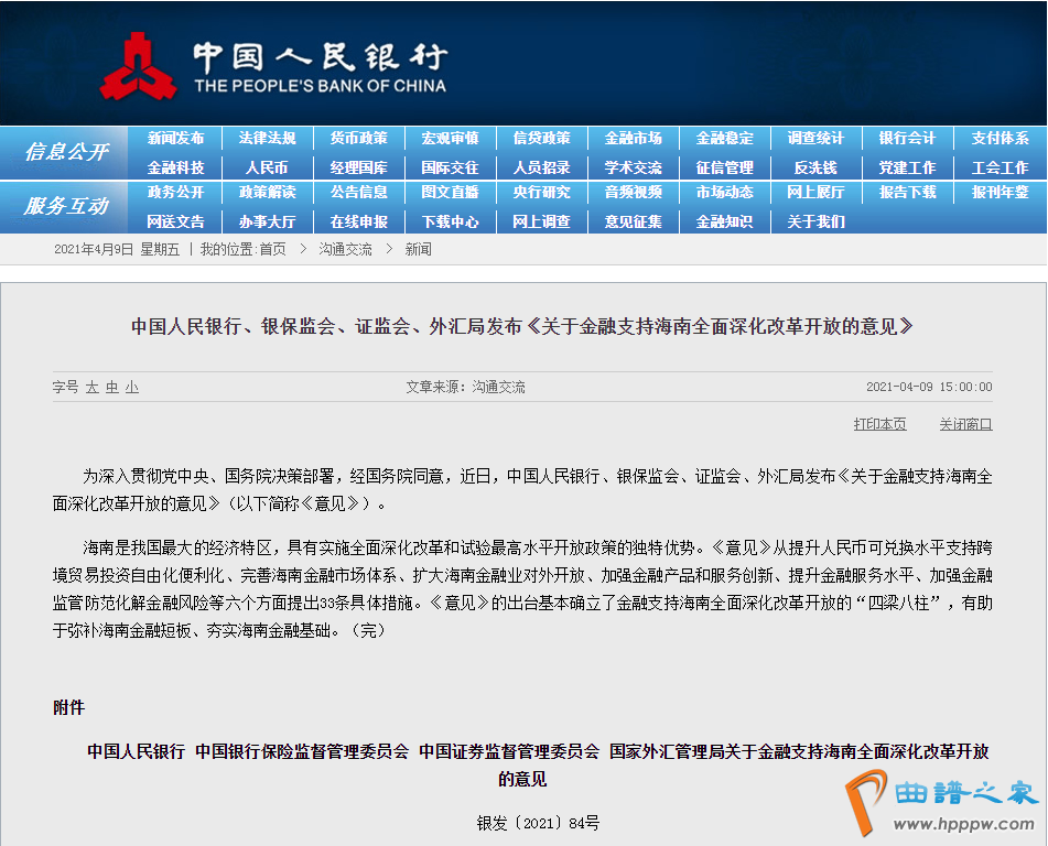 4月9日,据中国人民银行官网消息,中国人民银行、银保监会、证监会、外汇局发布《关于金融支持海南全面深化改革开放的意见》。