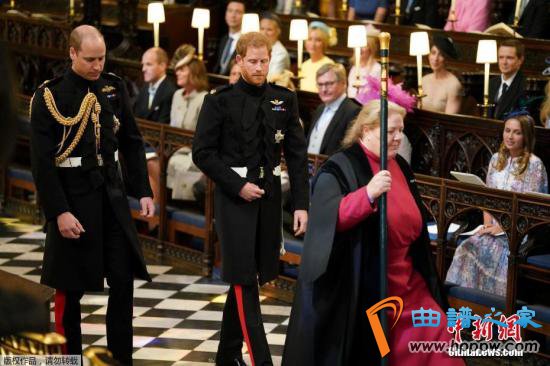 当地时间2018年5月19日,英国哈里王子与美国女星梅根·马克尔在英国温莎城堡举办婚礼。图为新郎哈里王子与伴郎威廉王子走入教堂。