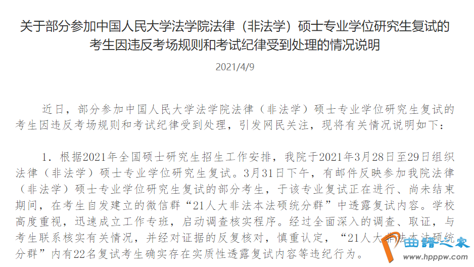1.根据2021年全国硕士研究生招生工作安排,我院于2021年3月28日至29日组织法律(非法学)硕士专业学位研究生复试。3月31日下午,有邮件反映参加我院法律(非法学)硕士专业学位研究生复试的部分考生,于该专业复试正在进行、尚未结束期间,在考生自发建立的微信群“21人大非法本法硕统分群”中透露复试内容。学校高度重视,迅速成立工作专班,启动调查核实程序。经过全面深入的调查、取证,与考生联系核实有关情况,并经对证据的反复核对,慎重认定,“21人大非法本法硕统分群”内有22名复试考生确实存在实质性透露复试内容等违纪行为。