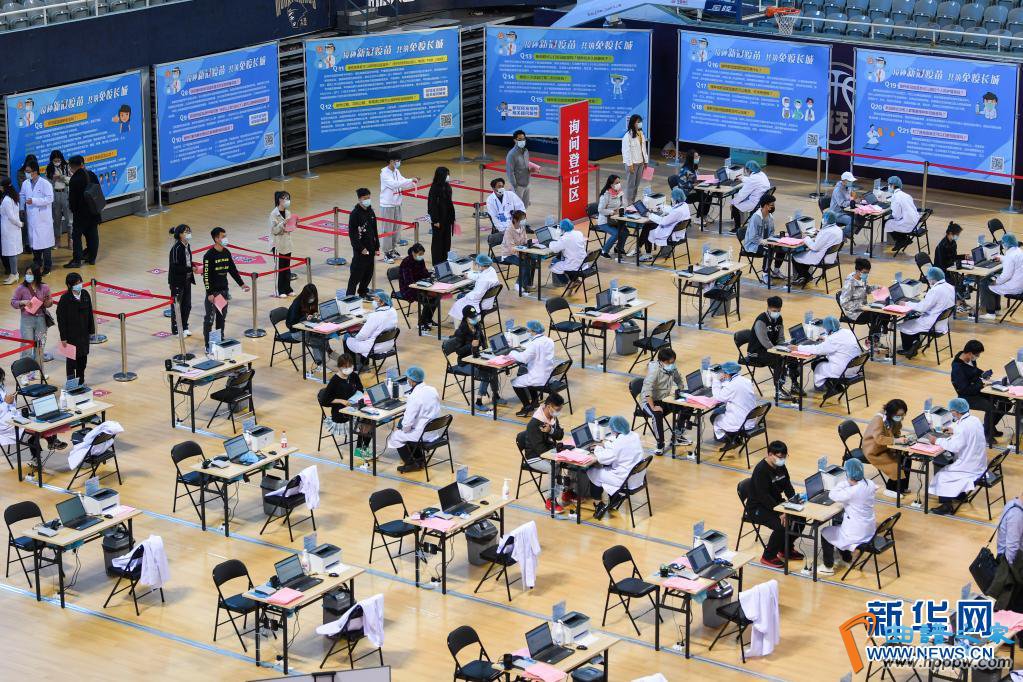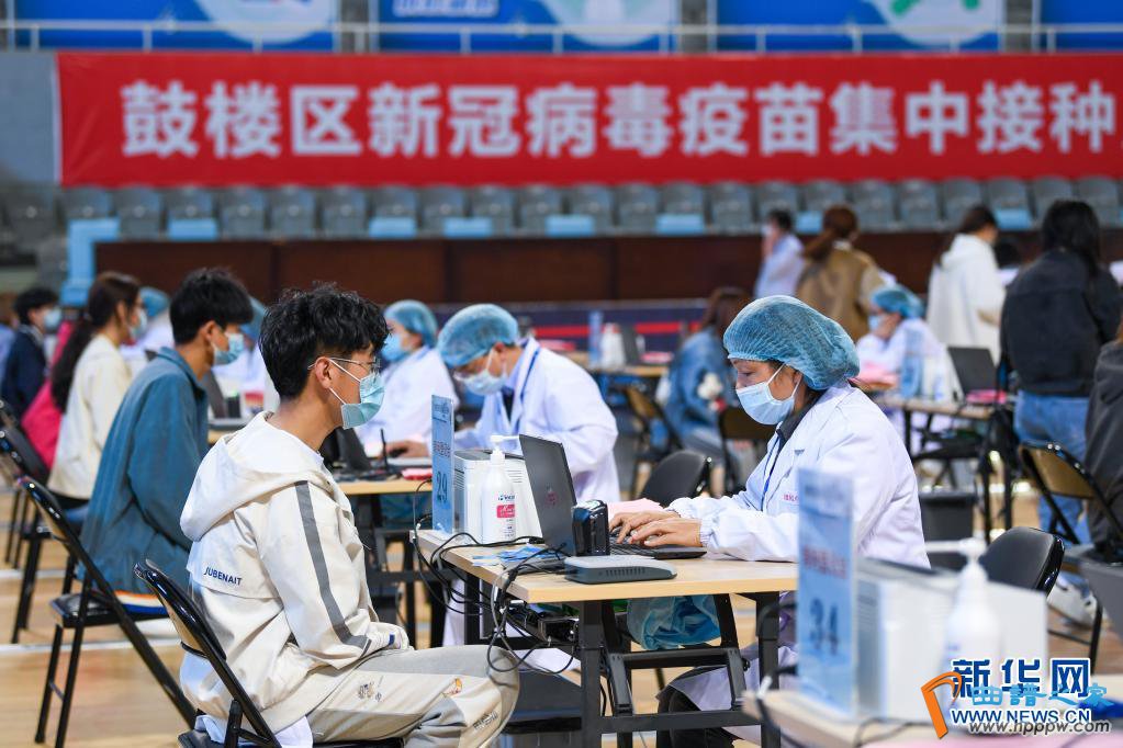4月9日,市民在南京市鼓楼区五台山体育中心设置的新冠病毒疫苗集中接种点登记,准备接种疫苗。近日,江苏省南京市在鼓楼区五台山体育中心设置新冠病毒疫苗集中接种点。这是目前南京市最大规模的集中接种点,单日接种量可达10000剂次。新华社记者 李博 摄