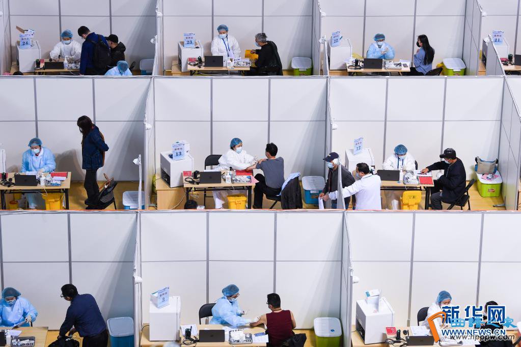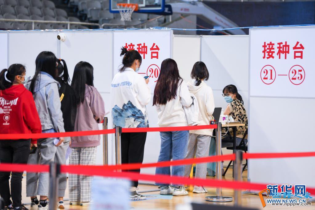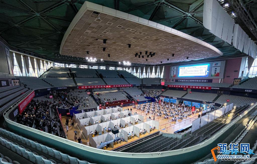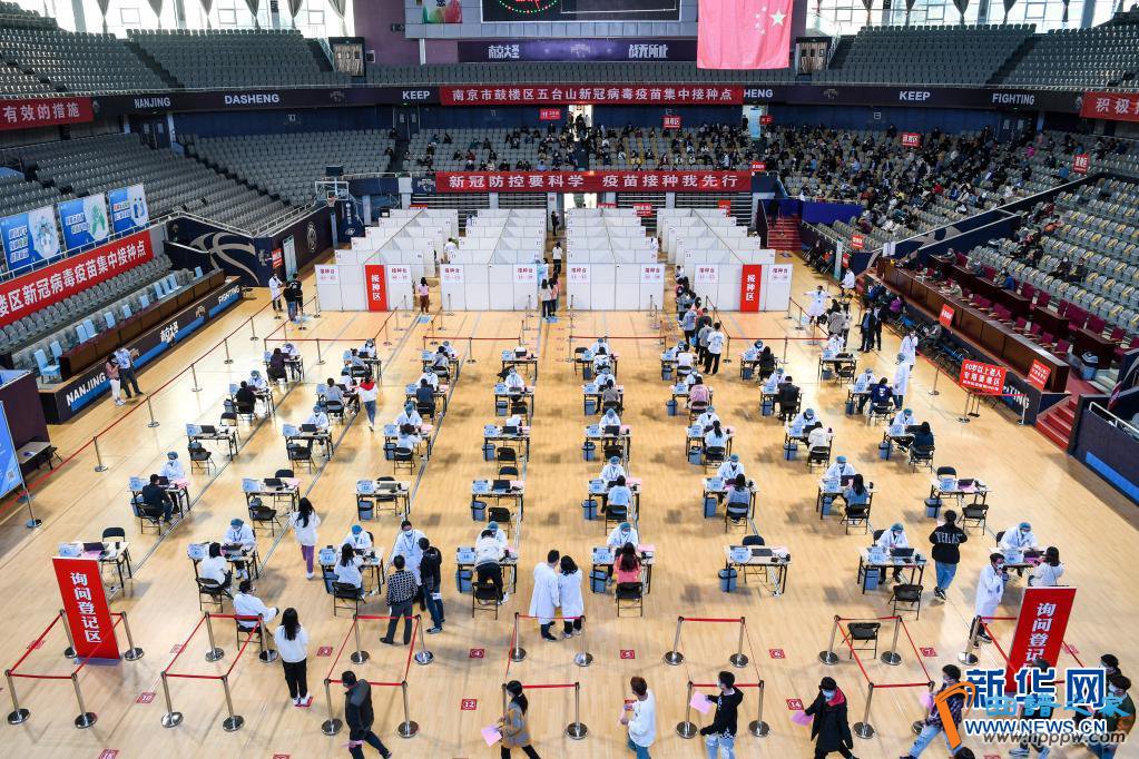4月9日拍摄的设置在南京市鼓楼区五台山体育中心的新冠病毒疫苗集中接种点。近日,江苏省南京市在鼓楼区五台山体育中心设置新冠病毒疫苗集中接种点。这是目前南京市最大规模的集中接种点,单日接种量可达10000剂次。新华社记者 李博 摄