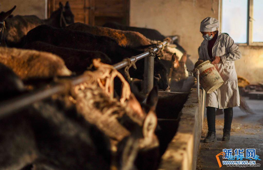 在新疆和田皮山县阔什塔格镇加依纳古特村,布威萨热·阿卜杜杰力在驴圈里忙碌(2月4日摄)。新华社记者 赵戈 摄