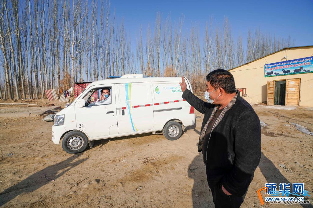 在新疆和田皮山县阔什塔格镇加依纳古特村繁荣养殖专业合作社,吾拉木·图尼亚孜向前来收购驴奶的企业工作人员打招呼(2月4日摄)。新华社记者 赵戈 摄