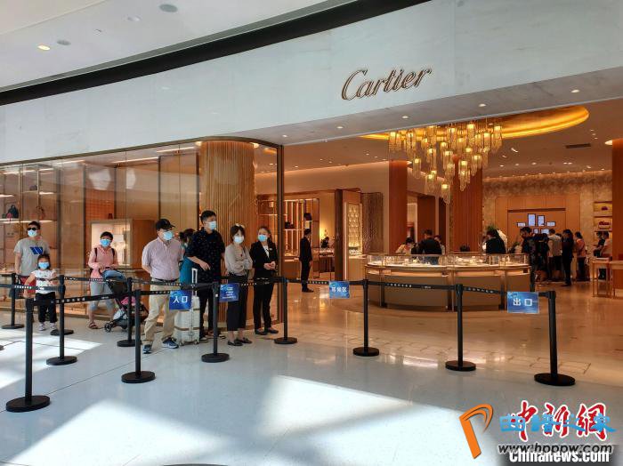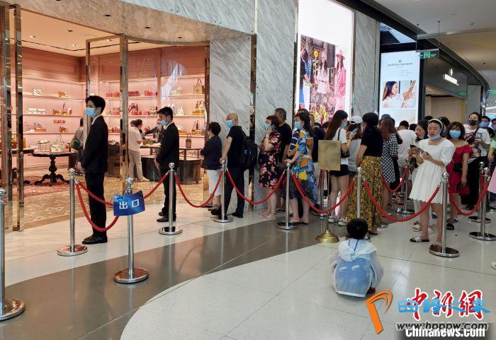 在三亚国际免税城,人们排队出示健康绿码,有序安检入场。免税城内的一些知名品牌专卖店,客流增多时店方设置围挡,排队限流。