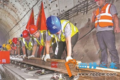 昨日,施工人员将十八号线最后一节钢轨架设在琶洲至冼村区间的道床上。广州日报全媒体记者骆昌威通讯员杨铭德、章嘉俊摄