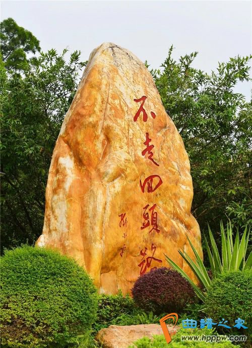 当年邓小平登山的东边入口处,目前已经建成罗三妹山入口牌坊,左侧巨石上镌刻着邓小平同志“不走回头路”的名言。